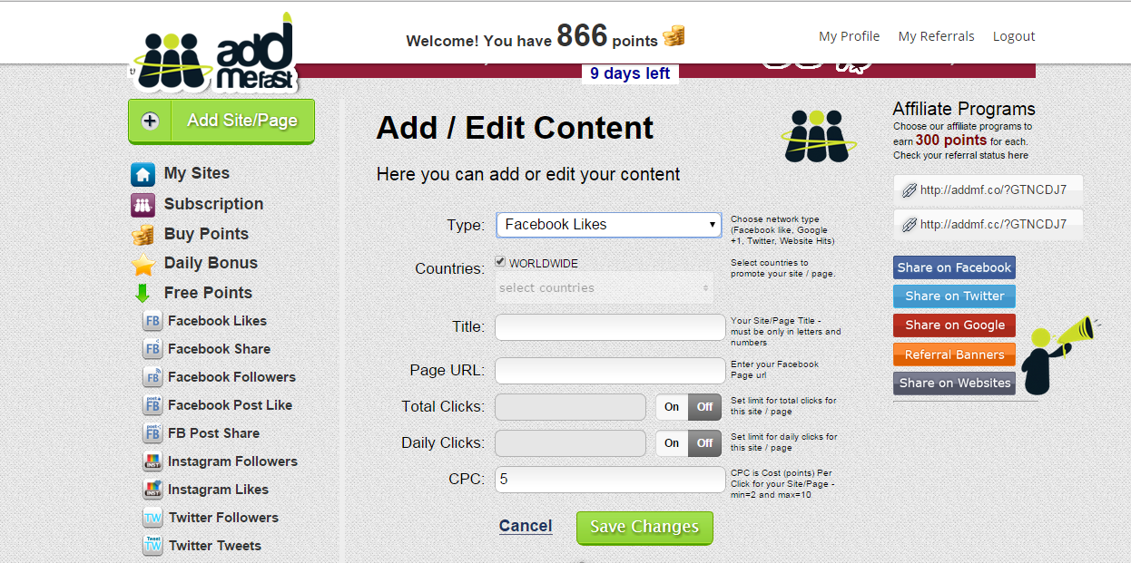 ¡Muy buenas! ¿Estás buscando la manera de conseguir un empujón social para un website? En caso afirmativo posiblemente te interese usar los servicios de la página web Addmefast. En esta web podrás canjear puntos por acciones sociales de todo tipo en diversas redes sociales como Twitter, Youtube, Facebook, Intagram, etc. La verdad es realmente útil aunque si eres legal esos puntos cuesta conseguirlos, pero no te preocupes que yo te enseño el truco de todo esto.