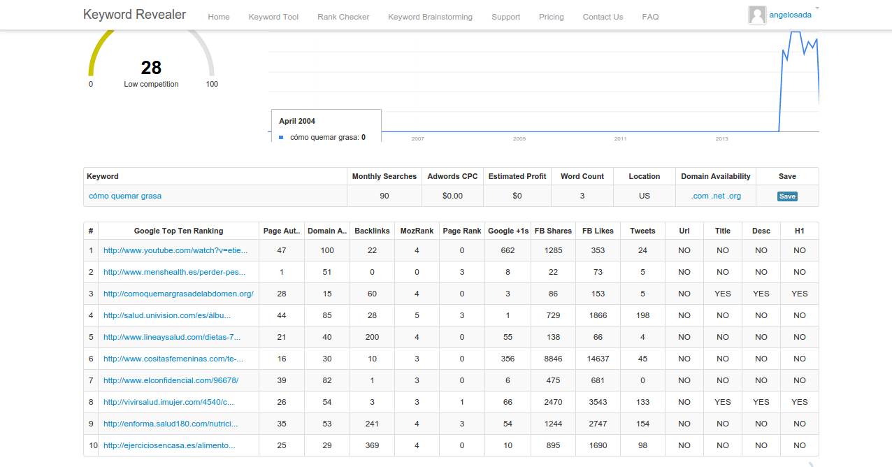 Esta herramienta es mi preferida y la mejor en mi opinión. Las ventajas que ofrece son el poder escoger el buscador(Google, Bing, Youtube, App Store) sobre el que queremos estudiar una palabra clave y definir buscador regional e idioma de manera totalmente gratuita. Para la palabra clave “quemar grasa” me arroja estos datos: