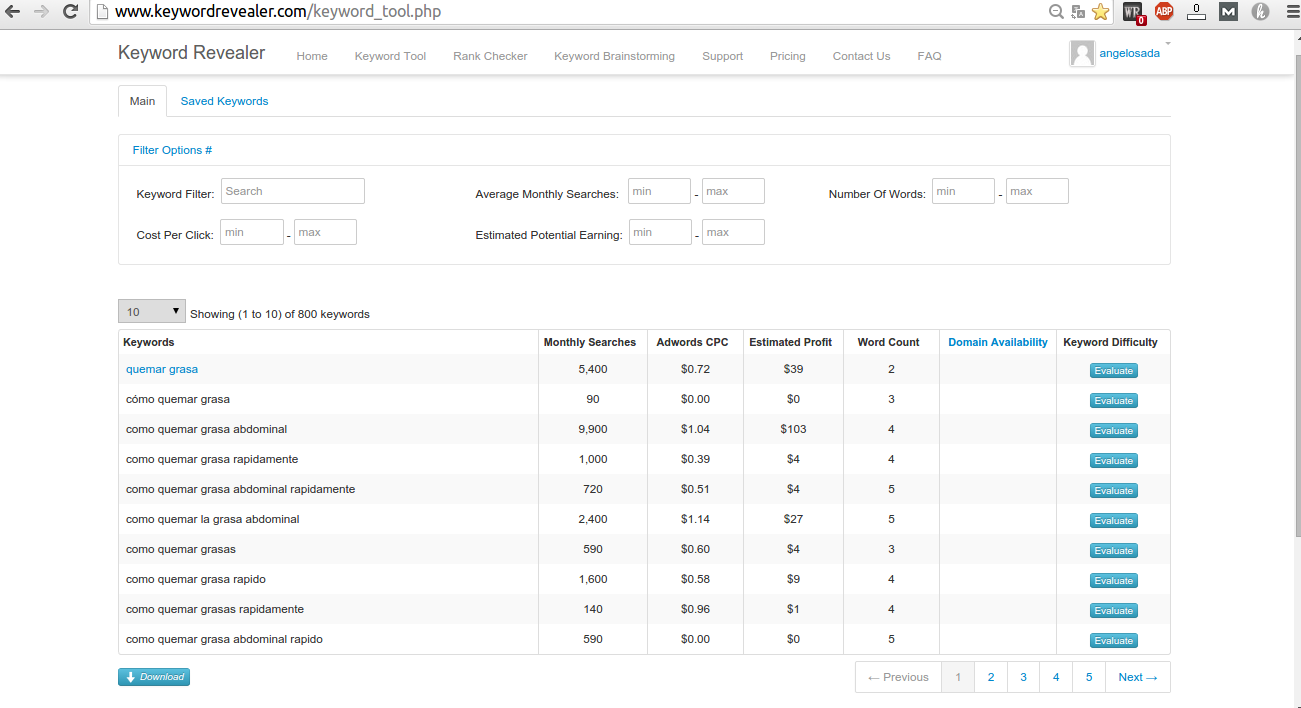 Quizás la más completa de las tres, pero al ser de pago para más de una búsqueda pierde el primer puesto. Esta herramienta permite filtrar por buscador, CPC, búsquedas mensuales, ganancias potenciales y número de palabras lo que la convierte en un buscador muy completo. Entre los datos mostrados están los mismo por los que se puede filtrar.