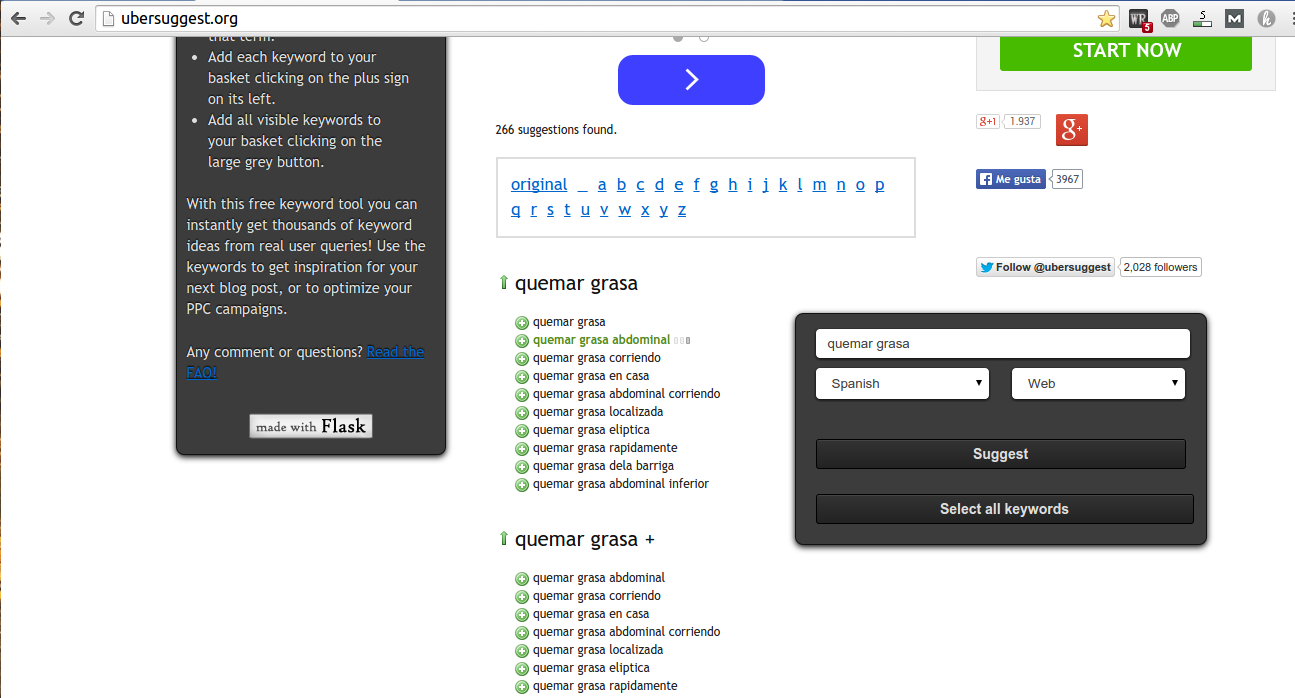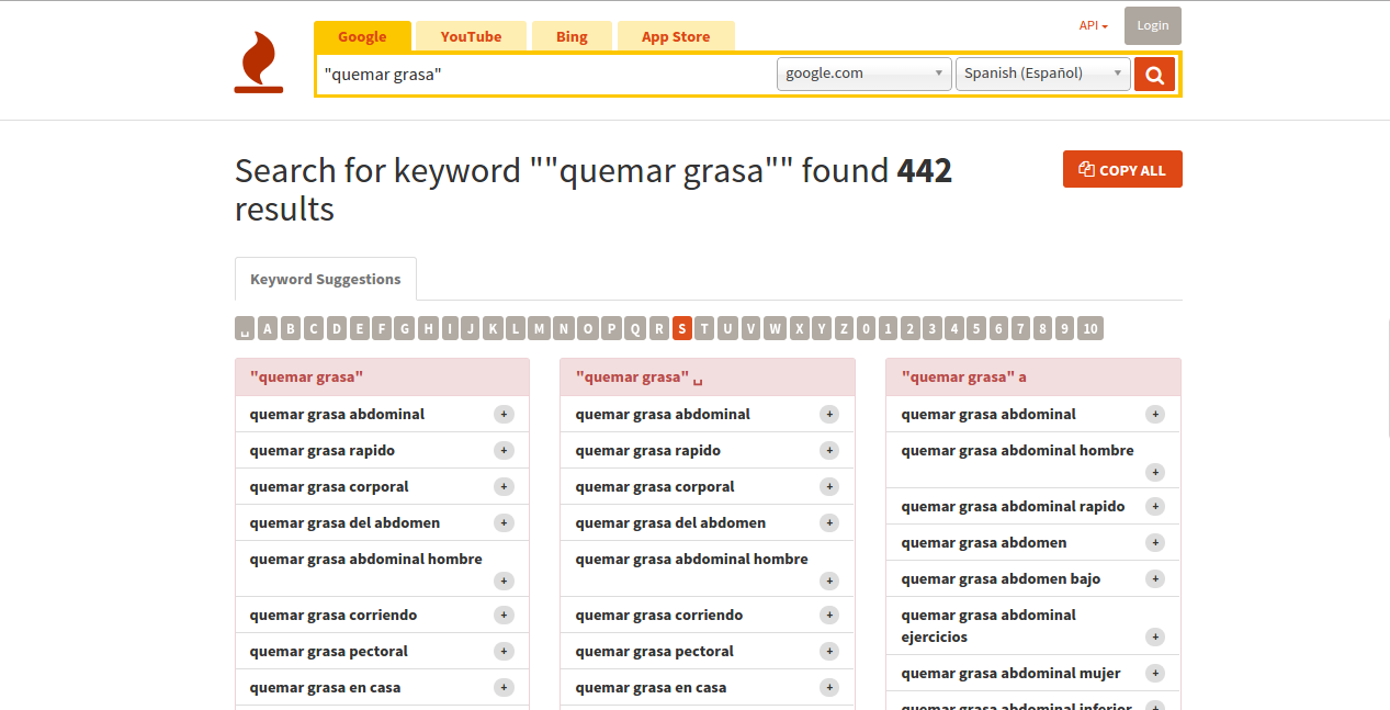 Para realizar la búsqueda he puesto quemar grasa entre comillas para indicar que solo quiero resultados para la palabra clave exacta y además he filtrado por resultados en español para el buscador google.com. Como se aprecia en la imagen la herramienta muestra todas las palabras clave long tail más buscadas y además luego las clasifica por la primera letra de la extensión.